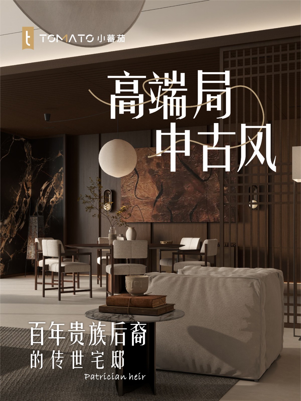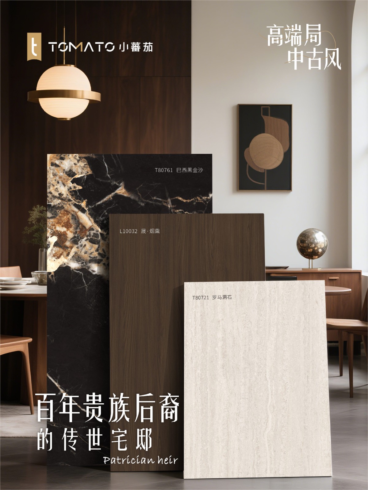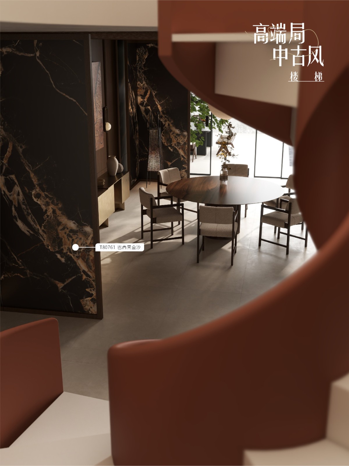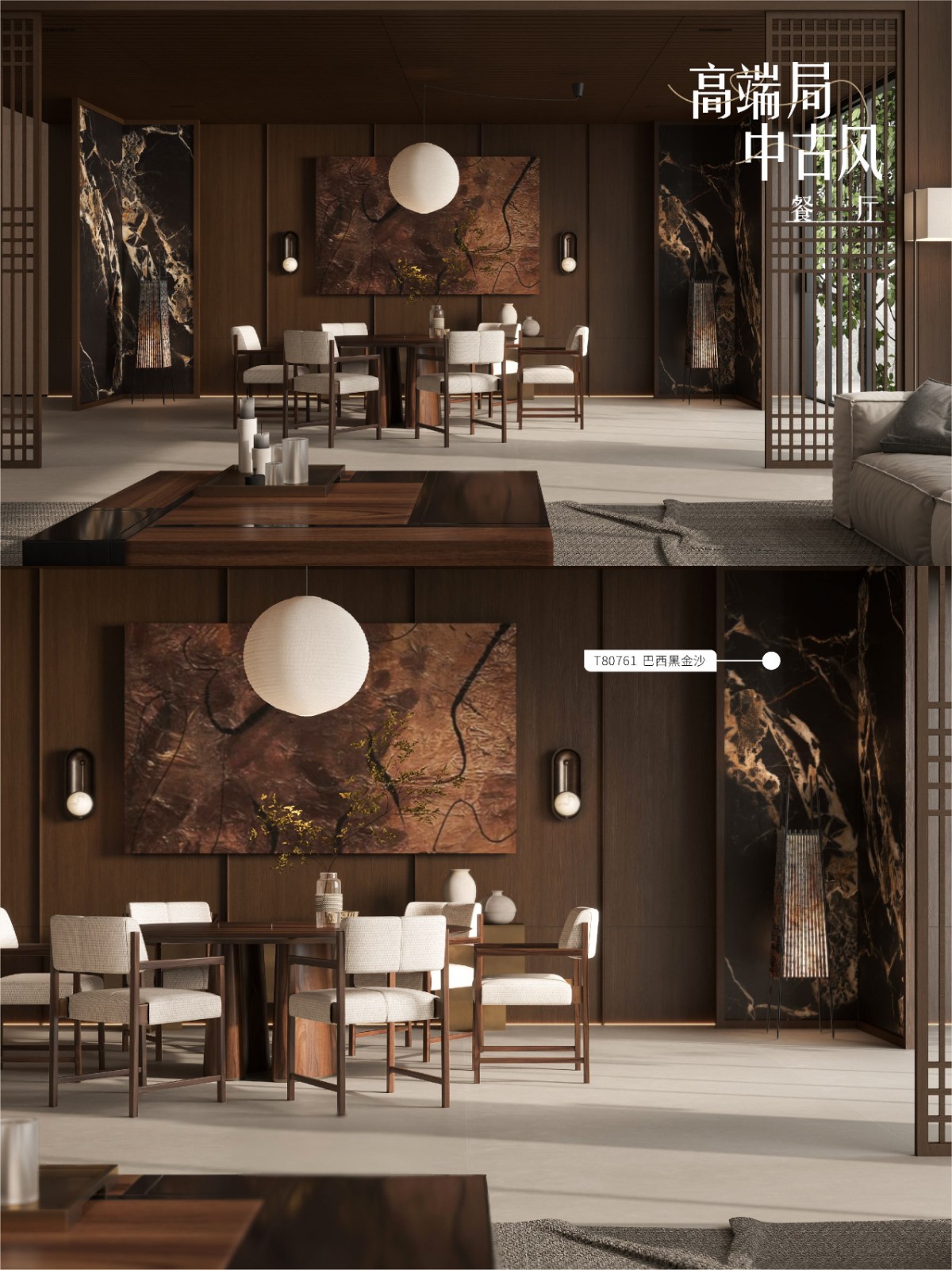 灵魂配色 L10032晟·烟熏(橡木)× T80761巴西黑沙金(奢石)× T80721罗马洞石,馥郁奢华的中古美学。௸ 空间 ◖会客厅:整体追求雅奢有度的意境与氛围表达,古典醇厚的烟熏橡木包裹整个空间,巴西黑沙金奢石如星河倾泄,与东方意境的壁画交相辉映,为这场奢华盛宴落下点睛之笔。每一处材质都演绎着贵族世家的非凡品味,将中世纪的美学精髓与现代雅奢气质完美交融。三面围合式布局,集会客、休憩、观景一体, 在光影流转间展现独特的审美和仪式感。 ◖开放式厨房:古典醇厚的烟熏木纹与粗矿天然的罗马洞石形成质感碰撞,铜质吊灯在石纹肌理上投下温暖光晕,营造出充满岁月质感的静谧烹饪空间。 ◖地下层桌球娱乐室:从天井引入日光,使得空间更加敞亮,橡木饰面墙体搭配同色系的沙发减少地下室的冰冷感,古典摩登的壁画与墨绿色桌球台形成对比,让每一次击球都成为充满仪式感的雅致社交。 ◖主卧室:烟熏橡木以温润的弧度环抱睡眠区,罗马洞石带着月光般的柔辉,共同构筑起一方远离尘嚣的雅谧私域。
