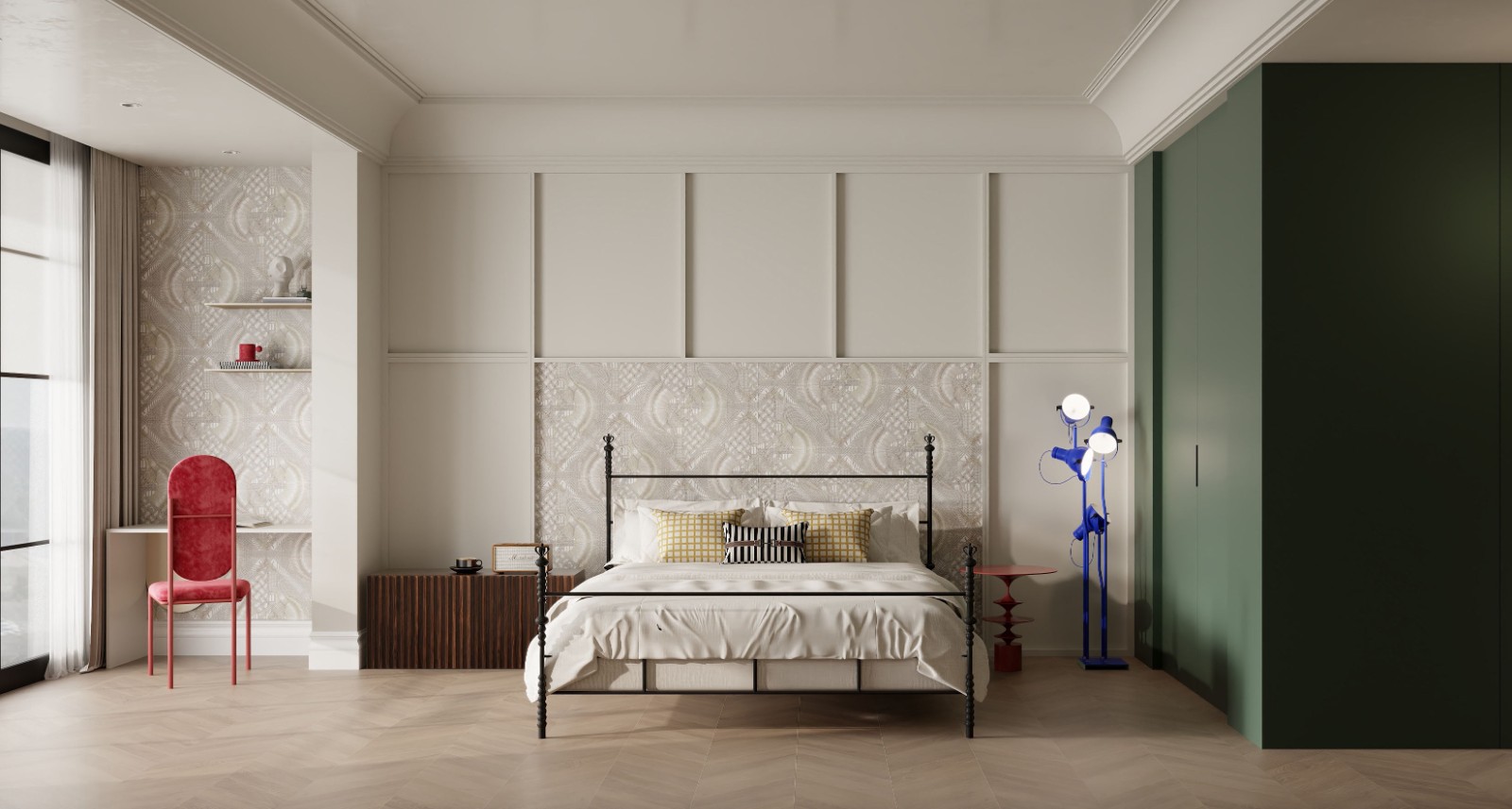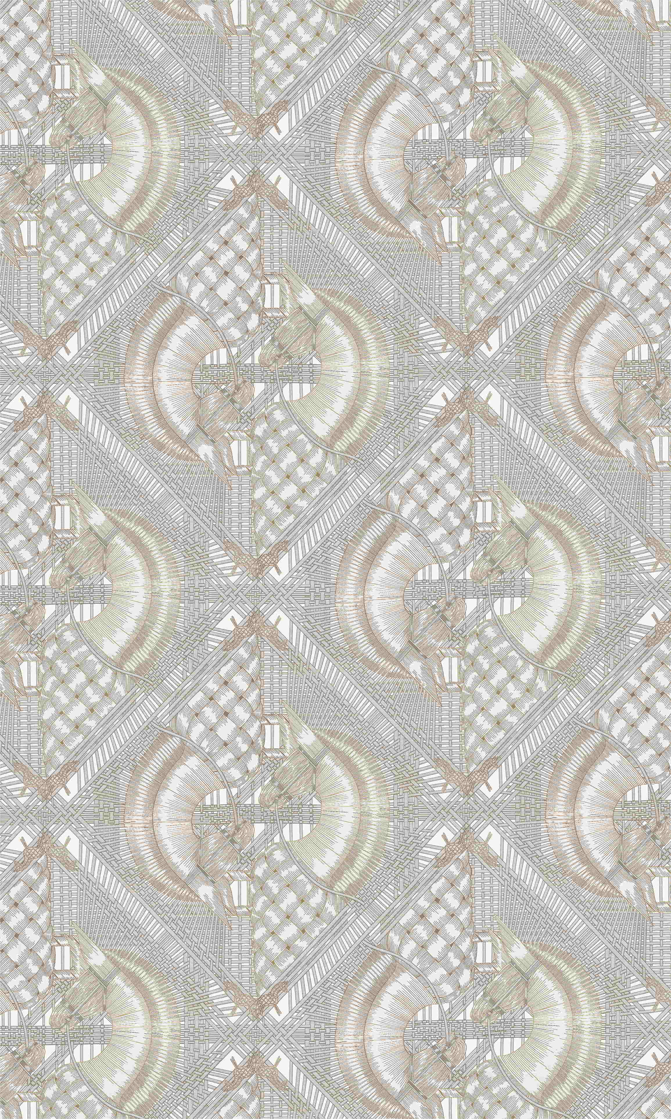 以梦为马,以昂首挺胸的马头作为视觉中心,用暖灰色的编织纹交错出阵列感。在白底上,金色和浅咖的布纹马首形成缓和对比,整体画面做了高光处理,立体感十足。强烈的布纹质感,可以作为卧室背景墙、衣帽间背板,复古,优雅,更象征着能力、智慧与成就。